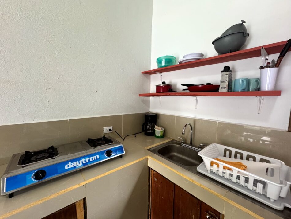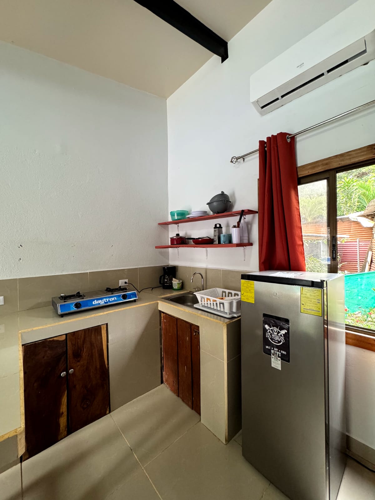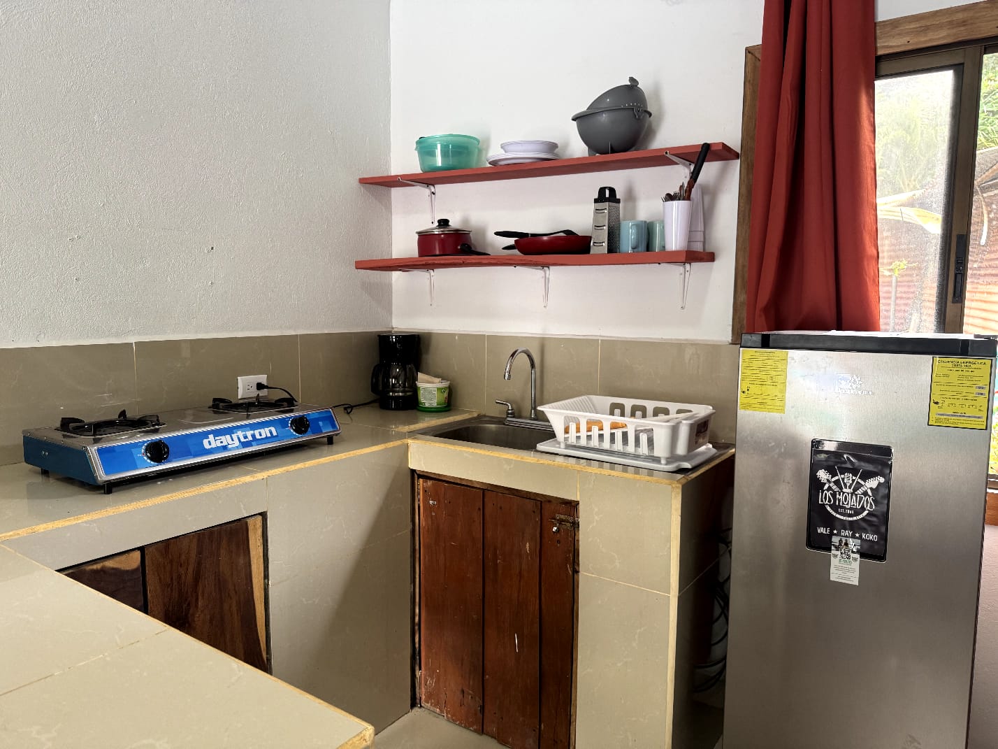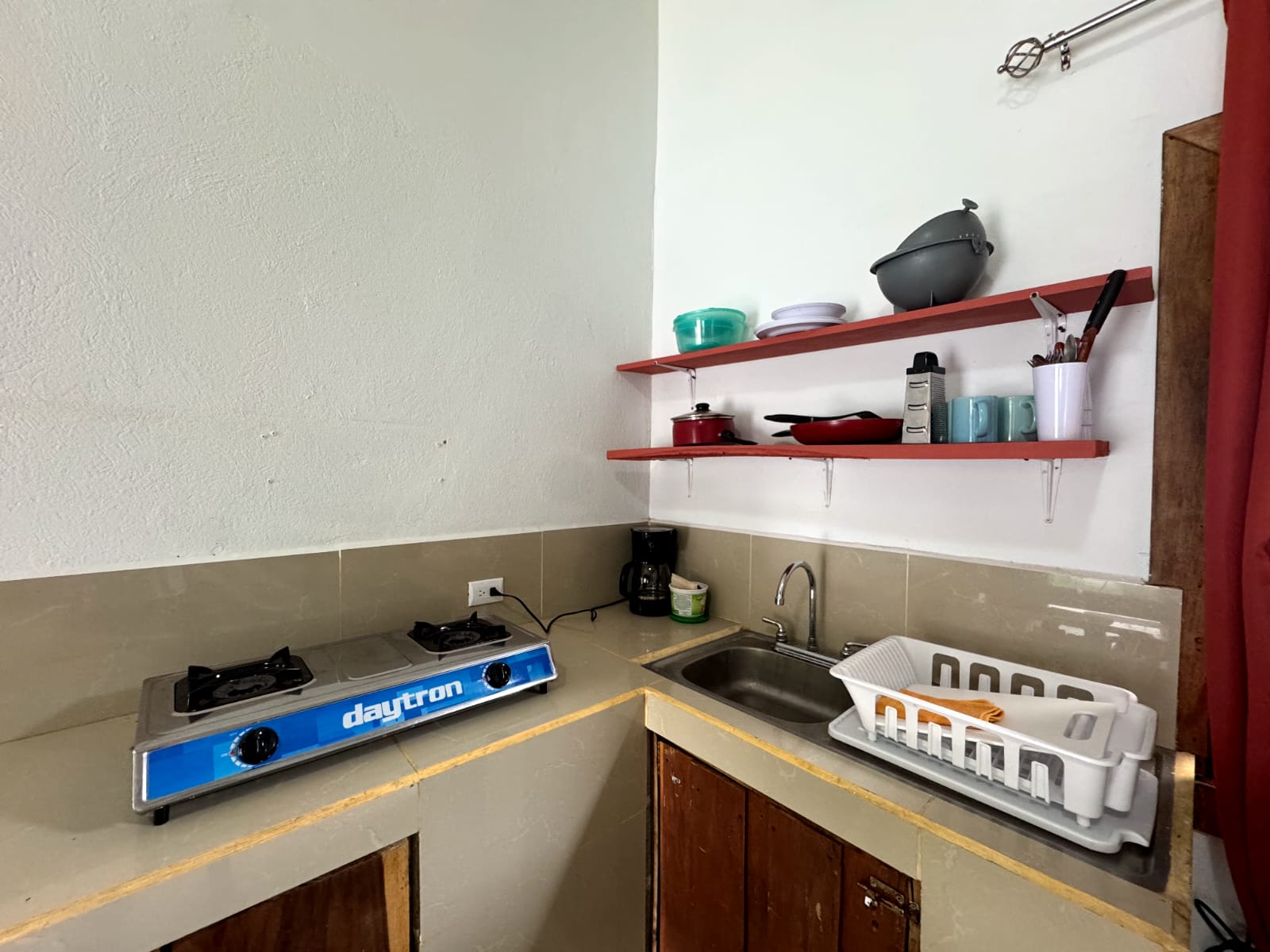 • Shared Kitchen Rancho: Prepare meals or snacks in our fully equipped, open-air kitchen—perfect for cooking fresh local ingredients or enjoying a casual meal with other guests, equipped with a coffee machine, drinking water, microwave, refrigerator, mugs, glasses, and utensils for your convenience.