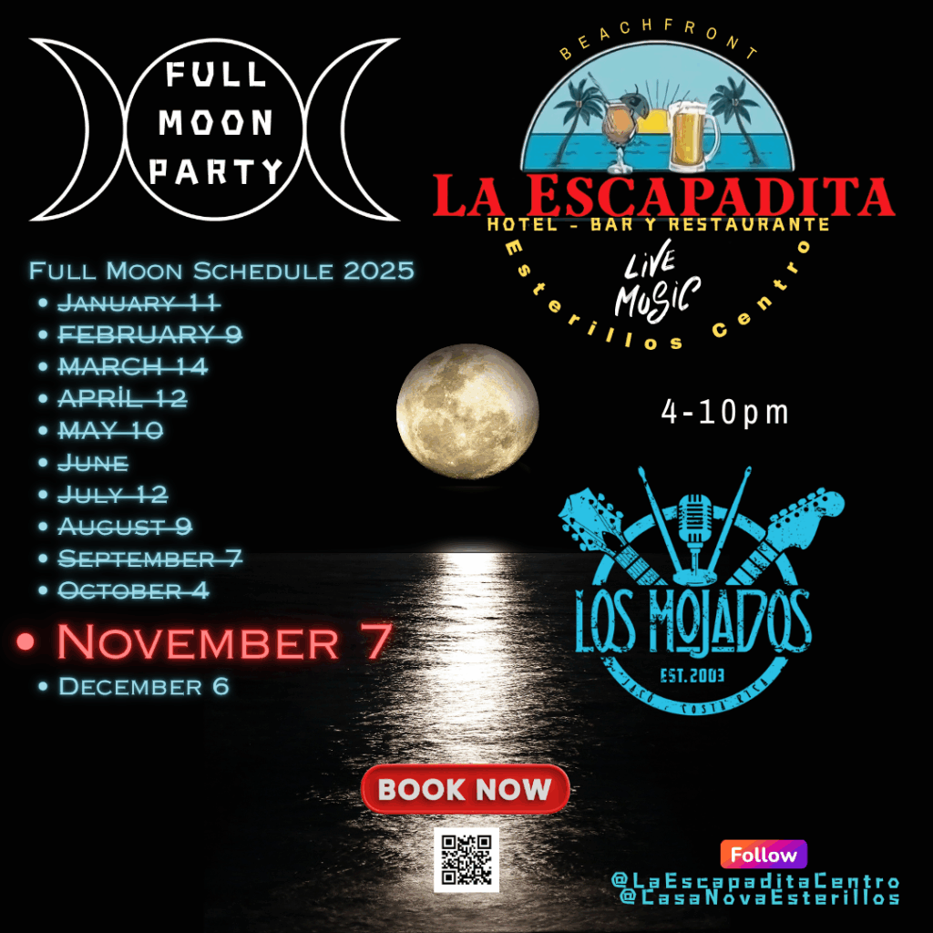 When the moon is full, the energy at La Escapadita comes alive like nowhere else on the Central Pacific. Join us for one of the most legendary beachfront parties in Costa Rica β where community, music, and moonlight collide under the stars in Esterillos Centro.